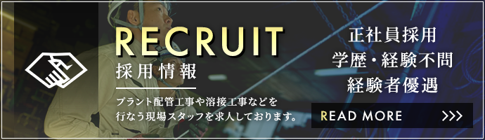 私たちが請け負う分野はプラント配管および溶接、空調・給排水に衛生設備と多岐にわたります。これらの分野に柔軟に対応できる理由は「挑戦し続ける姿勢」にあります。限界を超えた先にのみ組織として進化を果たせるものと信じ、一歩一歩ひたむきに前進を続けています。